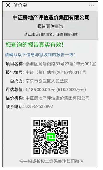 自2018年1月1日起,公司(含分公司)出具的房地产、土地、资产等非征收类评估报告,报告书中全部有报告审核系统 自动生成的二维码,通过扫描该二维码即可查询报告信息。价格评估和征收类评估报告没有二维码的可拨打14900018884查询报告真伪!